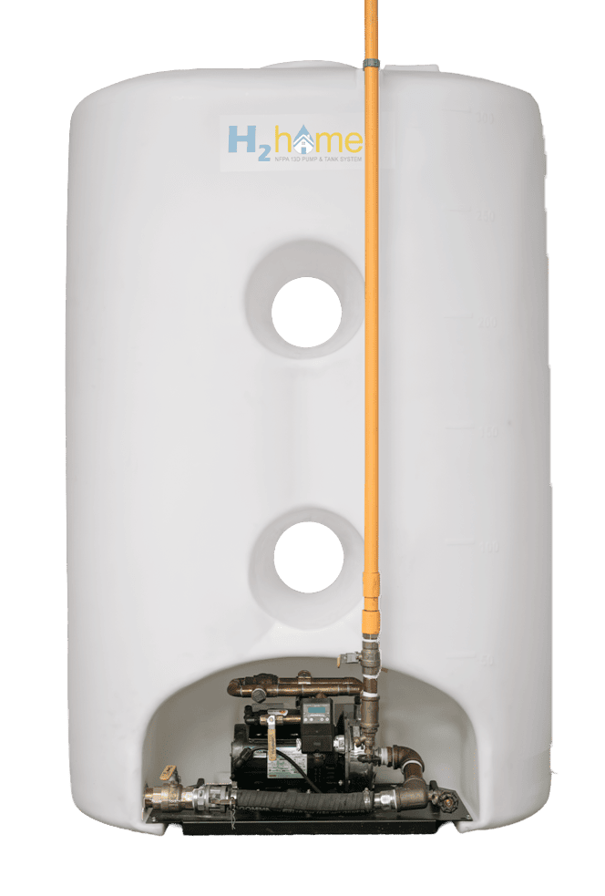 Designed & built specifically to meet NFPA 13D requirements, the H2hOme® is everything you need to provide the required pressure and flow for a residential fire sprinkler system in a sleek, all-in-one package. This new 325-gallon model features a more compact design, making it ideal for installations where space is limited without compromising performance. Additionally, it is the only stand-alone system on the market featuring an easily removable slide-out pump assembly for simplified maintenance and service.