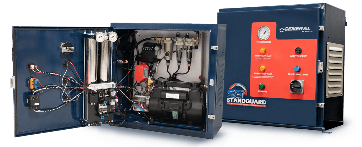 With built-in low & high air pressure alerts, excessive run alerts for leak detection, and optional dryer & heated cabinet for unconditioned or cold environments, it’s one package to meet the new NFPA 14 Supervisory Air Requirements.